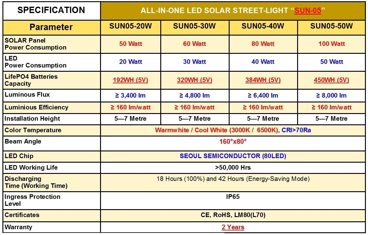 คุณสมบัติพิเศษของชุดโคมไฟถนน LED SOLARCELL SUN-05
