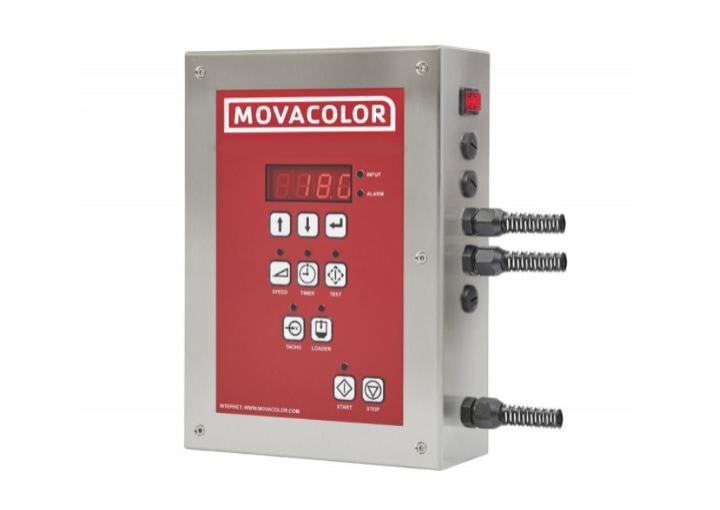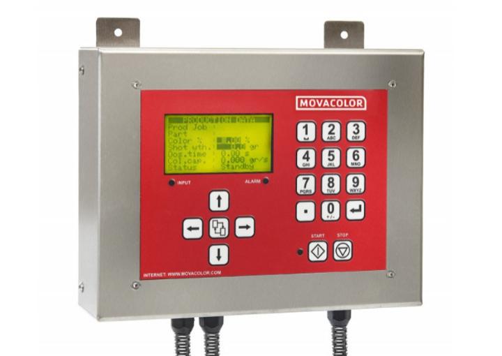 The MC12 controller requires manual adjustment of dosing speed and time and works for injection molding and extrusion applications. The display has a 4-piece 7 segments LED display.
